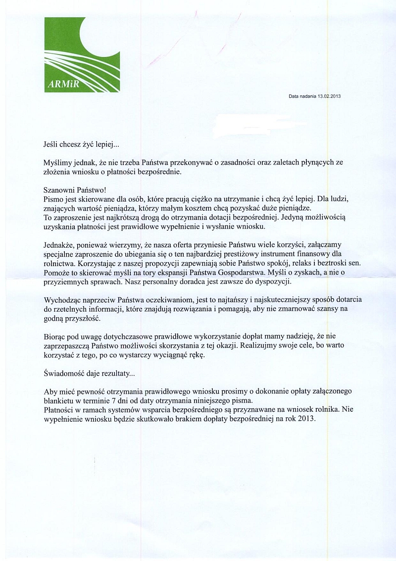 Do Agencji Restrukturyzacji i Modernizacji Rolnictwa dotarły informacje, że rolnicy z różnych regionów Polski otrzymują pisma, opatrzone logotypem łudząco podobnym do logotypu ARiMR, w których anonimowy autor zachęca do wpłacania pieniędzy na podany numer konta bankowego, w celu otrzymania dopłat bezpośrednich. Reklamuje to pismo jako "zaproszenie", które jest "najkrótszą drogą do otrzymania dotacji bezpośredniej". Dalej wskazuje, że korzystając z tej propozycji rolnik zapewni sobie "spokój, relaks i beztroski sen" i dołącza blankiet przekazu pocztowego z sumą do wpłaty 246 zł., z tytułem przelewu: "opłata za wniosek". Anonimowy autor nie precyzuje jednak na czym ma polegać skorzystanie z jego propozycji. Używa pojęcia bardzo nieprecyzyjnego, mogącego wskazywać np., że trzeba zapłacić za samo dostarczenie wniosku o przyznanie dopłat bezpośrednich, a przecież taki wniosek rolnik otrzymuje bez żadnych opłat. Przesłanie wypełnionego przez rolnika wniosku do Agencji, czy to w formie papierowej czy elektronicznej, także jest bezpłatne.