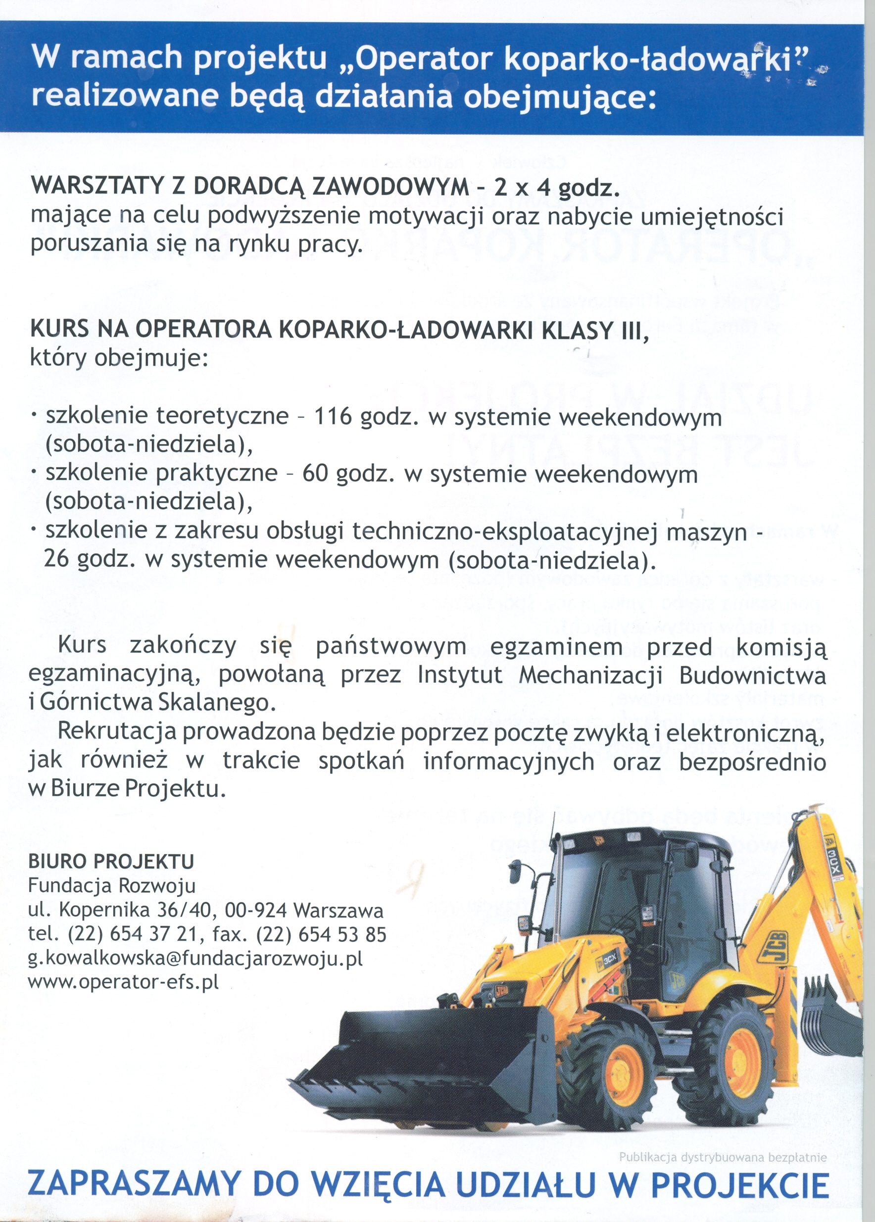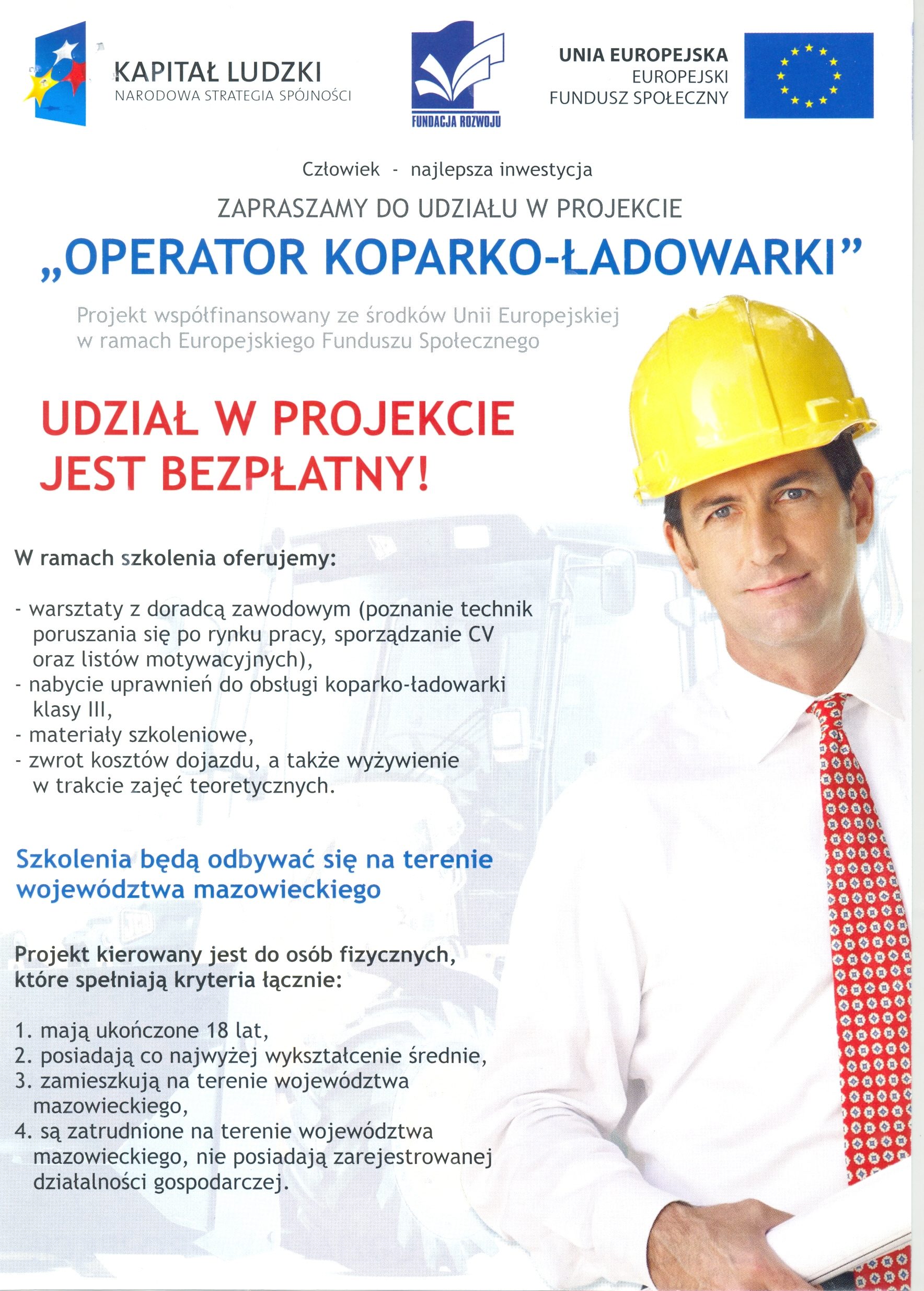 Od dnia 1 stycznia 2011 roku do 30 kwietnia 2012 roku Fundacja Rozwoju realizuje projekt „Operator koparko-ładowarki” w ramach Programu Operacyjnego Kapitał Ludzki, Priorytet VIII Regionalne kadry gospodarki, Działanie 8.1 Rozwój pracowników i przedsiębiorstw w regionie, Poddziałanie 8.1.1 Wspieranie rozwoju kwalifikacji zawodowych i doradztwo dla przedsiębiorstw.